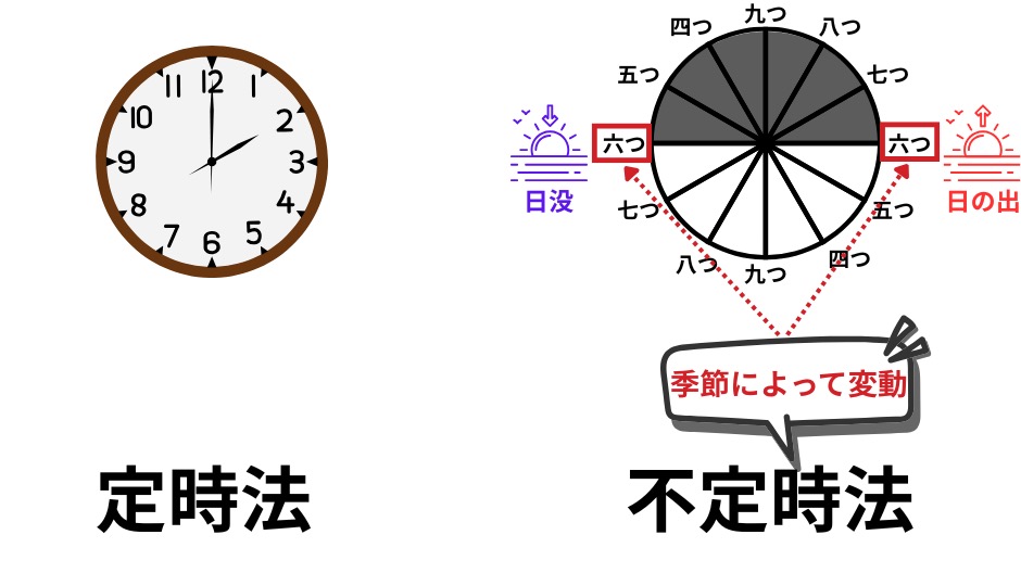 また、同時期には「不定時法」という制度が用いられ、昼と夜それぞれを6等分して「一刻(いっとき)」とする方式もありました。