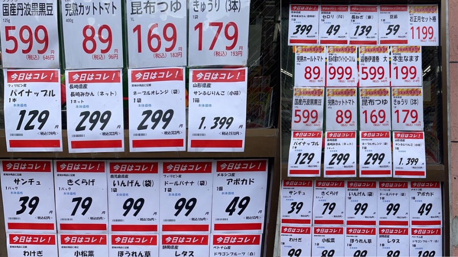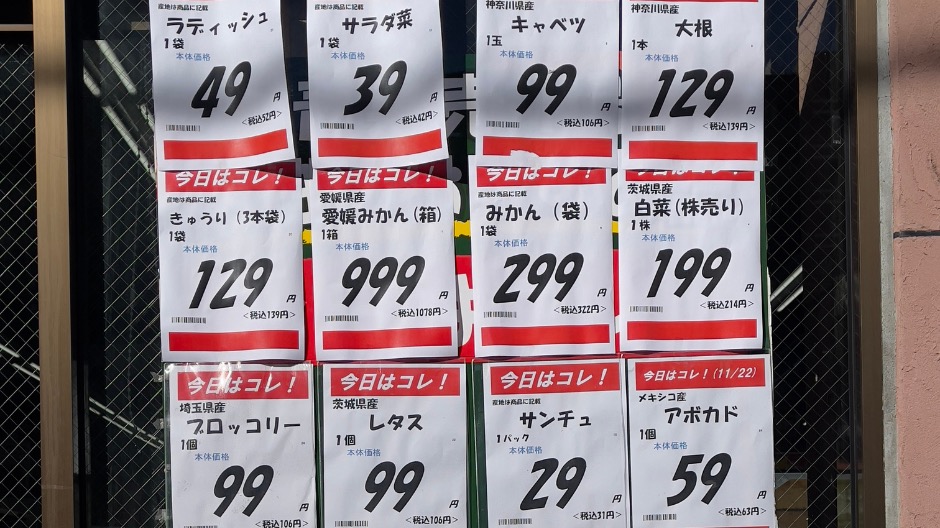 店にはこんな感じで、今日の安いものがバーっと貼られているので店内に入る前にチェックしてくださいね。