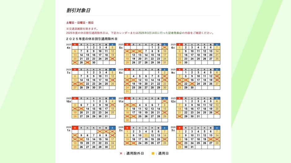 2025年度の大きな変更として、三連休は「休日割引の適用除外日」となりました。